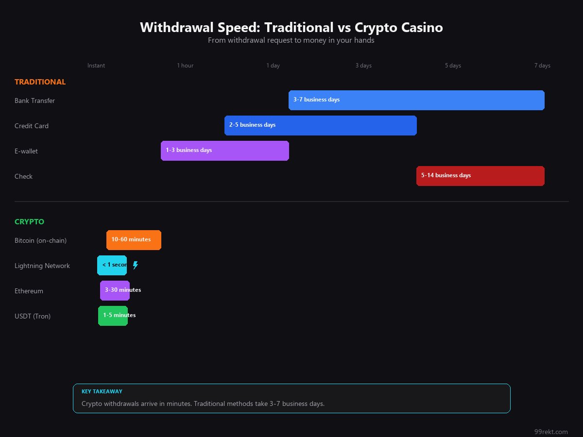 The reason for the gap is structural. When you withdraw from a traditional casino to your bank, the money moves through a chain of intermediaries: the casino's payment processor, correspondent banks, your bank's receiving queue. Each party has its own processing schedule and cut-off times. Crypto is peer-to-peer. When the casino sends funds to your wallet, there is no bank in the middle delaying things.