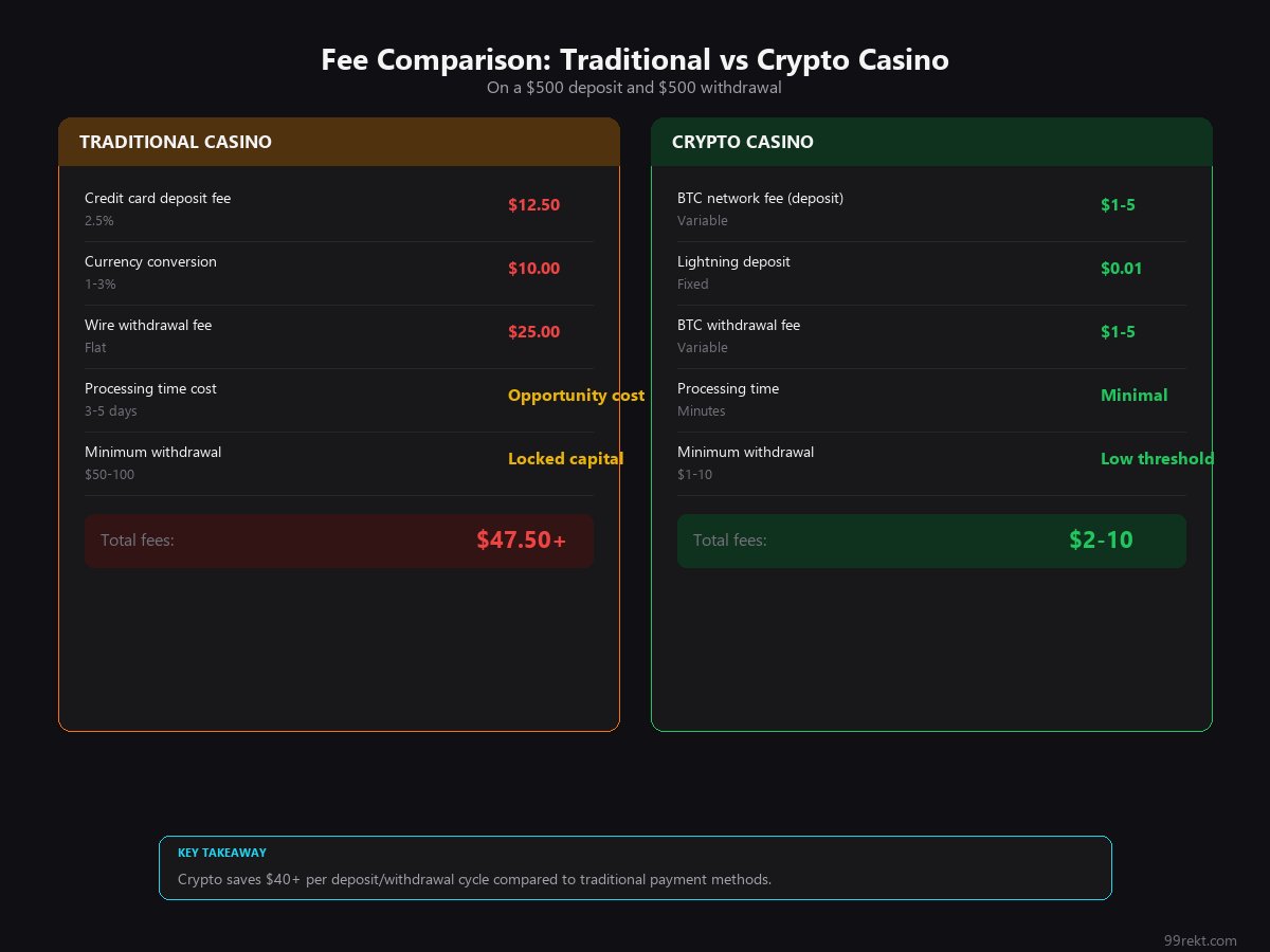 Example comparison: $100 bonus at a crypto casino with 50x wagering means you need to wager $5,000 before you can withdraw. That same $100 bonus at a traditional casino with 30x wagering means $3,000 in wagers. The crypto casino's bigger bonus does not always translate to a better deal once you account for the higher playthrough.