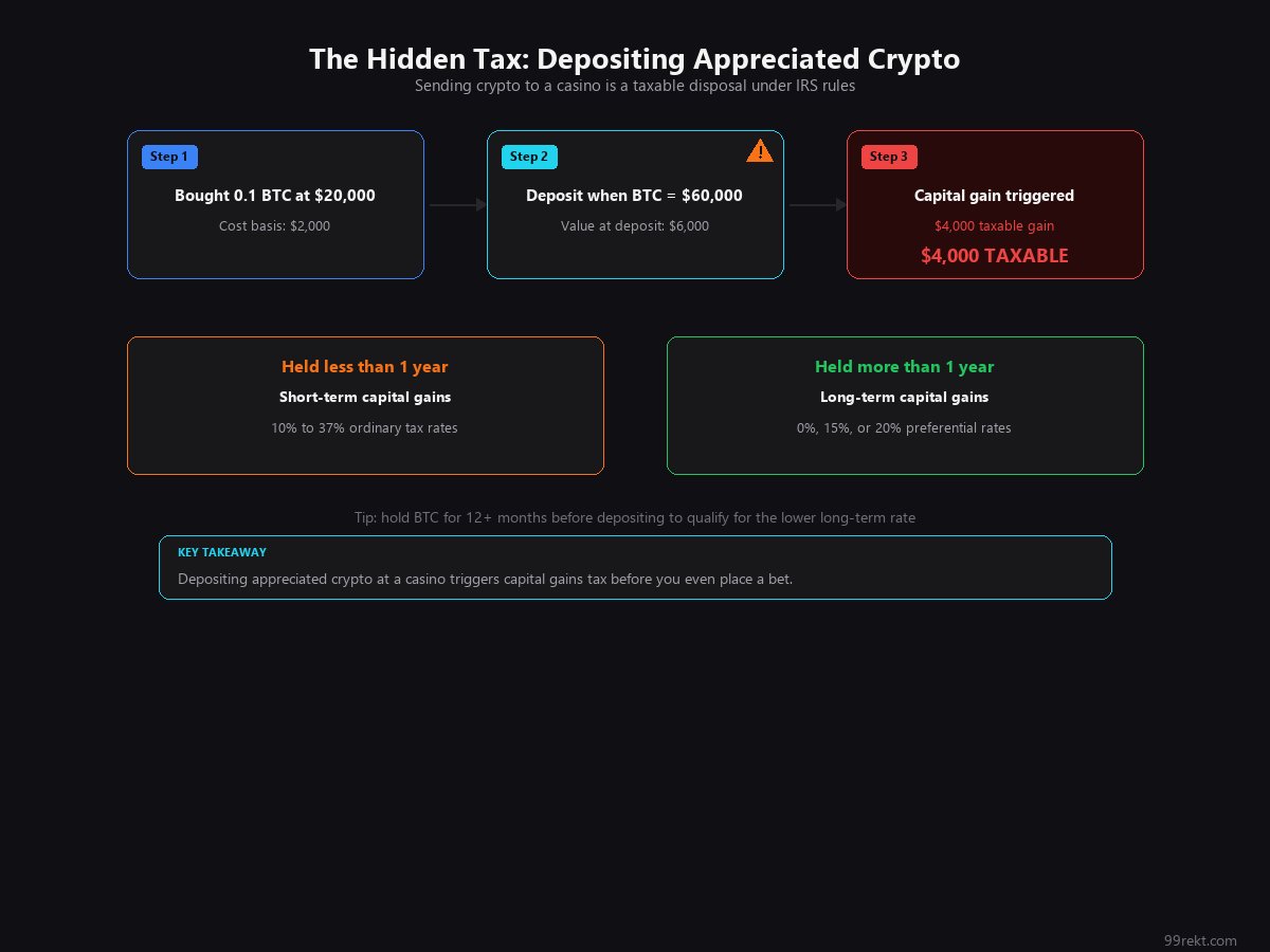 The takeaway is that playing with appreciated crypto means you are potentially paying tax twice: once on the capital gain from the deposit, and again on whatever you win. Cash gamblers do not face that first layer.