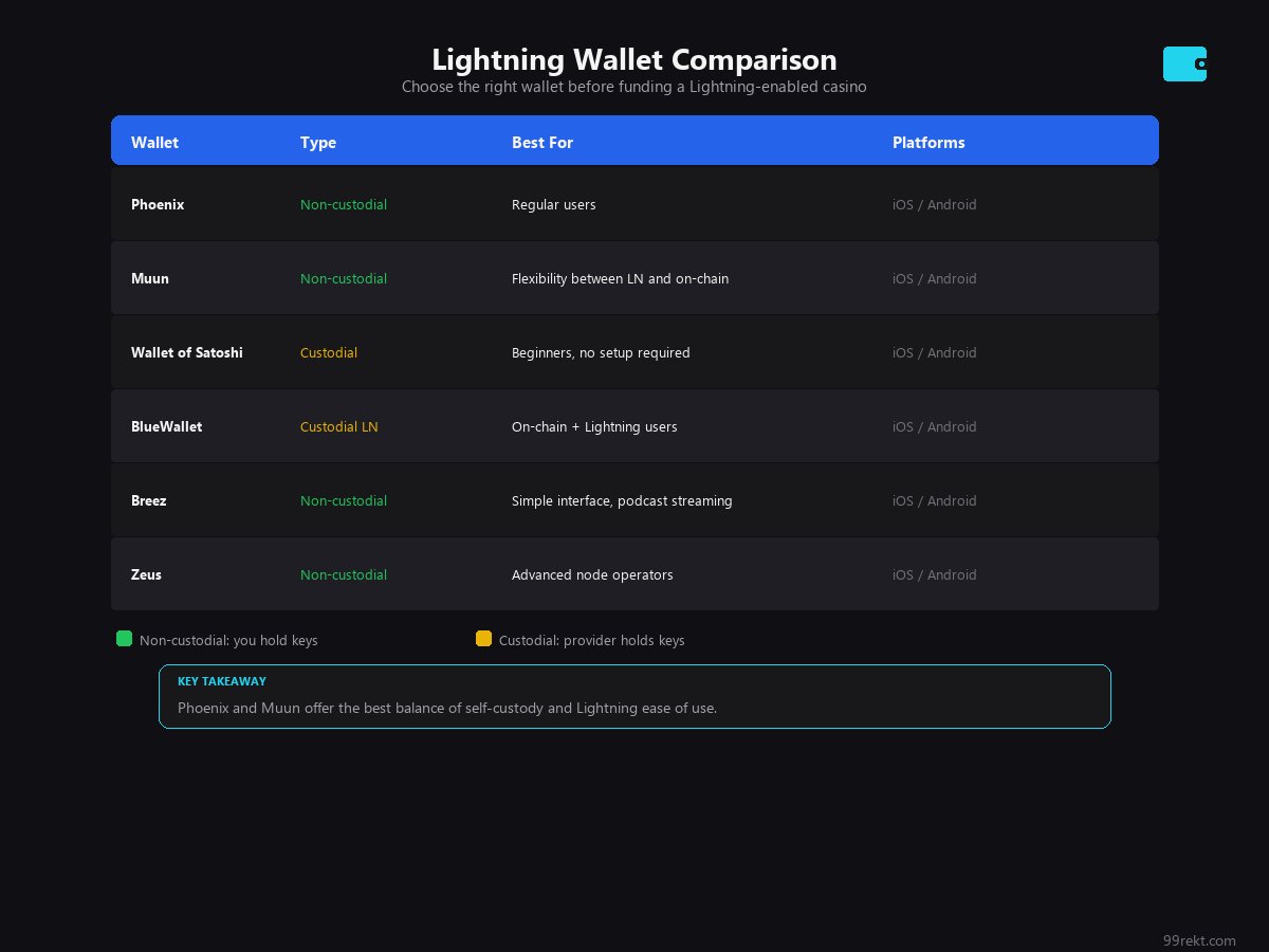| Wallet | Type | Best For | Platform | |--------|------|----------|----------| | Phoenix | Non-custodial | Regular users who want control | iOS, Android | | Muun | Non-custodial | Flexibility (handles both on-chain and Lightning) | iOS, Android | | Wallet of Satoshi | Custodial | Beginners, fastest setup | iOS, Android | | BlueWallet | Custodial Lightning | Users who also need on-chain | iOS, Android | | Breez | Non-custodial | Simple, clean interface | iOS, Android | | Zeus | Non-custodial | Advanced users connecting their own node | iOS, Android |