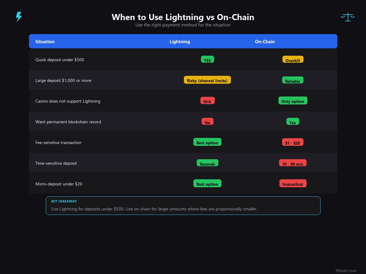 | Scenario | Use Lightning | Use On-Chain | |----------|--------------|--------------| | Quick deposit under $500 | Yes | Overkill | | Large deposit ($1,000+) | Possible but routing may fail | More reliable | | Casino does not support Lightning | N/A | Only option | | You want a permanent blockchain record | No (off-chain) | Yes | | Fee-sensitive deposit | Yes (fractions of a cent) | No ($1-$20) | | Time-sensitive (live betting, crash) | Yes (seconds) | No (10-30 min) | | Micro-deposit under $20 | Yes | Fees make it impractical |